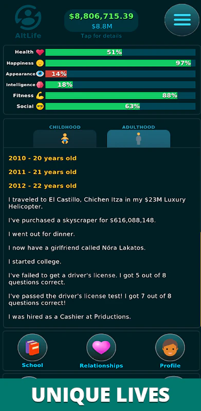 It is designed as a simple app with an elegant interface and only a few graphics. AltLife is a great strategic life simulator. Altlife life simulator premium apk.